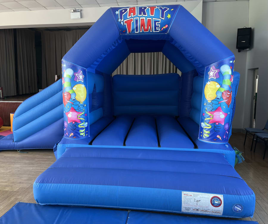The party time bouncy castle and slide is the perfect entertainment for any party, christening or special event.. Children enjoy bouncing around on this castle for hours and love the party time theme.
