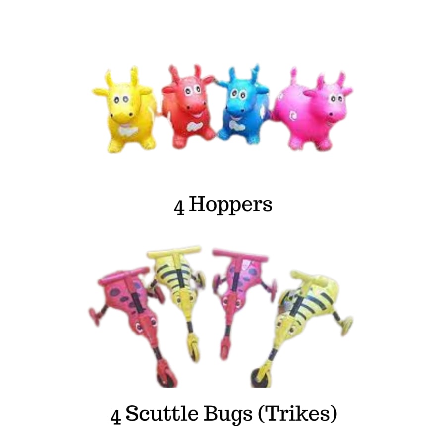 Why not make your party even better by adding on 4 Hoppers and 4 Scuttle Bugs (Trikes) to your inflatable [/]or Soft Play