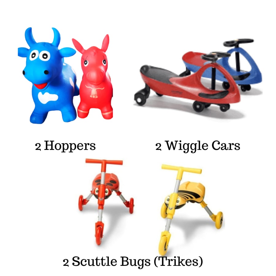 Why not make your party even better by adding on 2 wiggle cars, 2 Hoppers and 2 Scuttle Bugs (Trikes) to your inflatable [/]or Soft Play